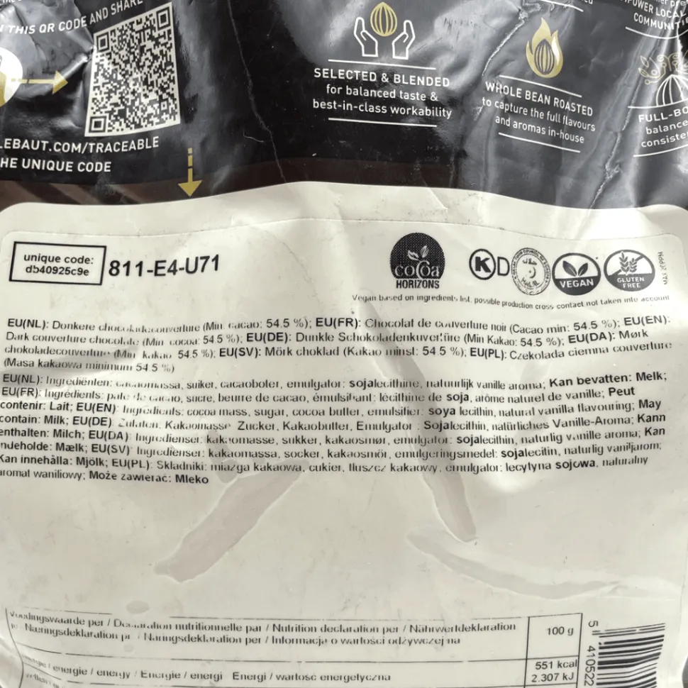 Barry Callebaut dark chocolate chips in a resealable, 2.5kg bag. This dark Belgian chocolate has a 54.5% cocoa content.