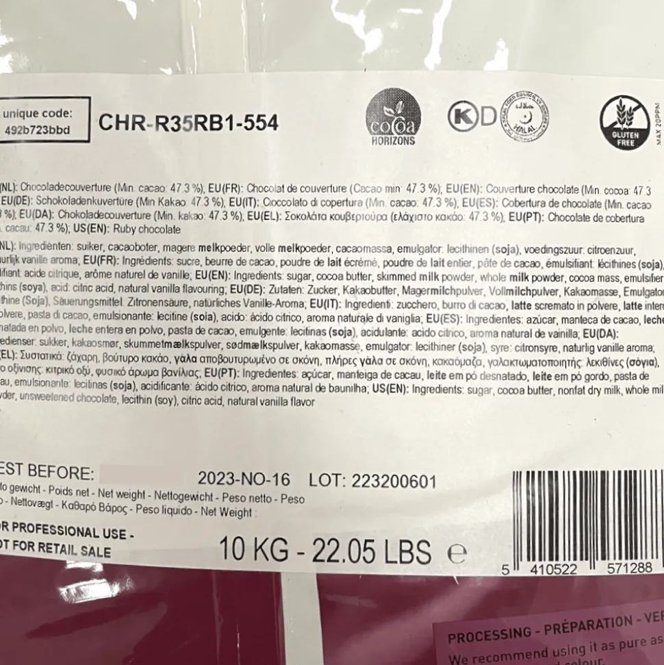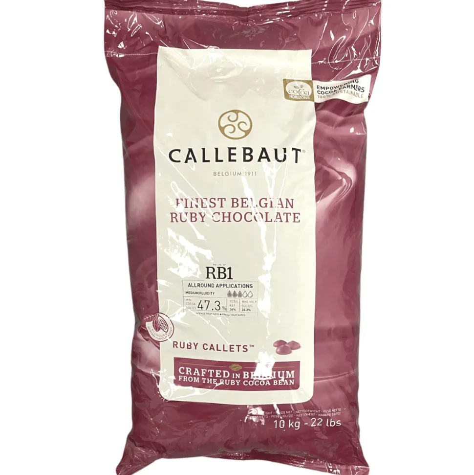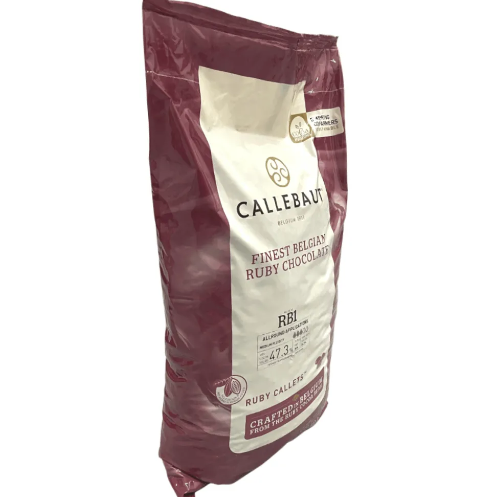 Ruby RB1’s all-around fluidity makes it ideal for a variety of applications ranging from moulding and enrobing to mousses and more. 10kg bag is ideal for catering and professional but these Callebaut Ruby chocolate chips are also available in smaller bag.