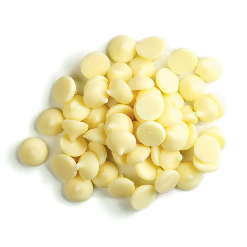 Callebaut white chocolate chips in a 2.5kg, resealable bag.