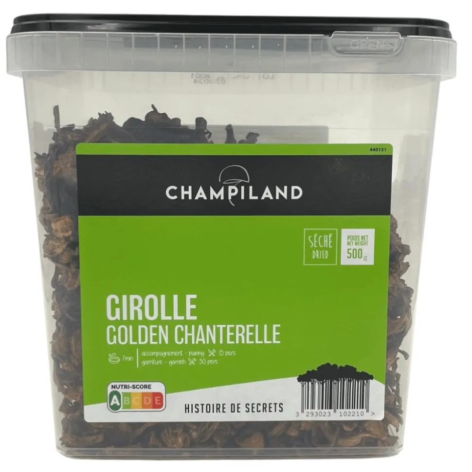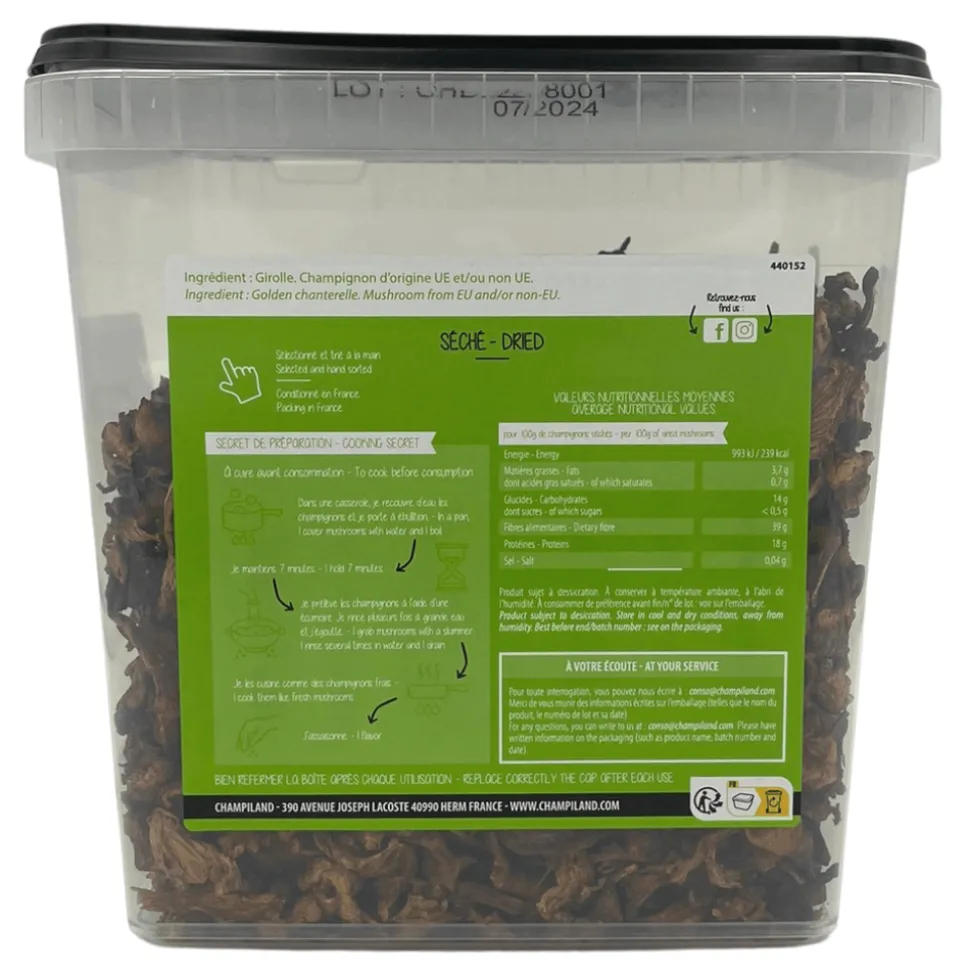 Dry girolles mushrooms, 500g box, ideal to use in risotto, broths, pasta…Soak the dry mushrooms in boiling water for 7 minutes, drain then rinse 2 or 3 times, and use as fresh mushrooms.