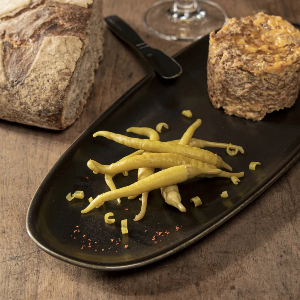 Guindillas are small, sweet and mild green chilli peppers grown in the Basque country. Pickled whole, they are traditionally eaten at apéritif time as a popular addition to cheese and charcuterie platters like the classic French cornichon, they bring a pleasant tartness and crunchy texture to the table, but with a hint of spice that makes them unique.