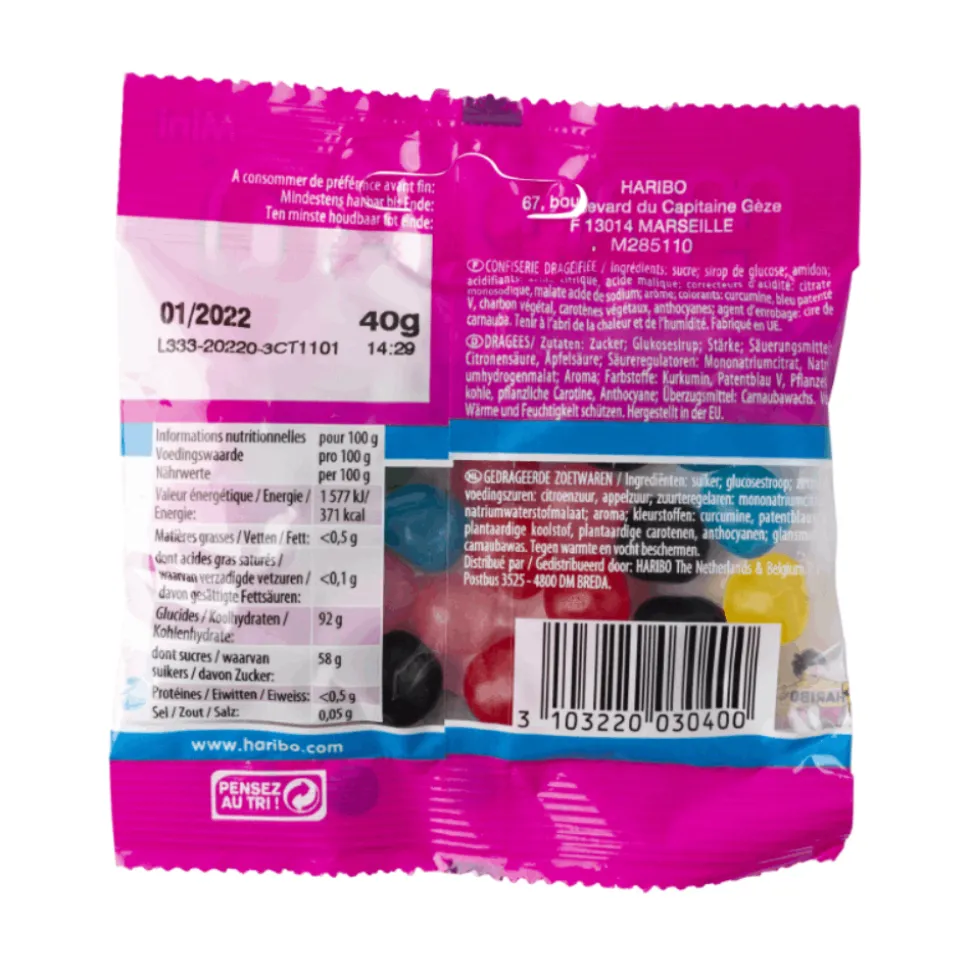 Ingredients – sugar, glucose syrup, starch, acidifiers: citric acid, malic acid, acidity correctors, monosodium citrate, sodium acid malate, flavour, colourings: curcumin, patent blue V, vegetable charcoal, vegetable carotenes, anthocyanins, conditioning agent coating: carnauba wax