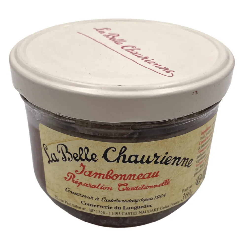 This jambonneau (ham hock confit) is made by traditional producer La Belle Chaurienne, based in beautiful Castelnaudary in the South of France. It has just four ingredients – ham hock, gelatine, salt and pepper – and it’s as delicious as it is simple.
