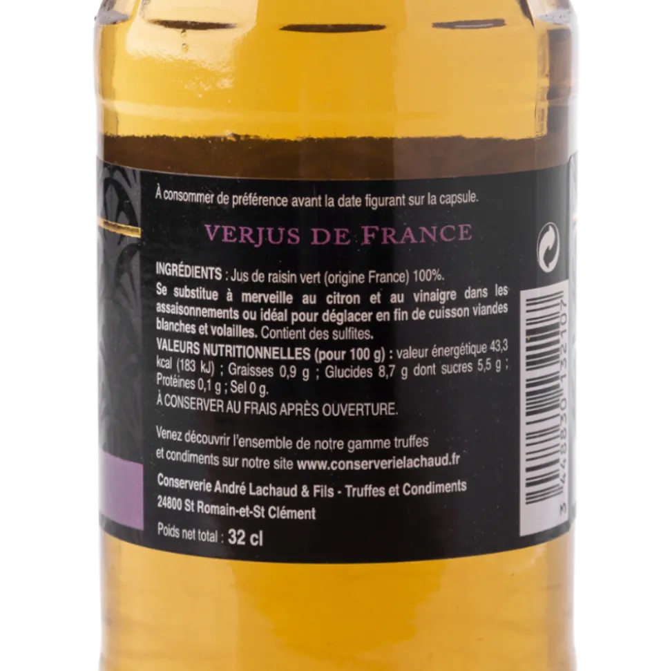 Discover verjus by Lachaud in a 320ml bottle. Derived from unripe grapes, verjus serves as a versatile ingredient. Use it as a substitute for vinegar or lemon juice in salad dressings, for deglazing meat, or enhancing risotto. Elevate your home-cooked dishes from starters to desserts with this excellent kitchen essential, adding an extra layer of flavour.