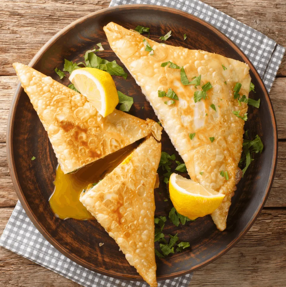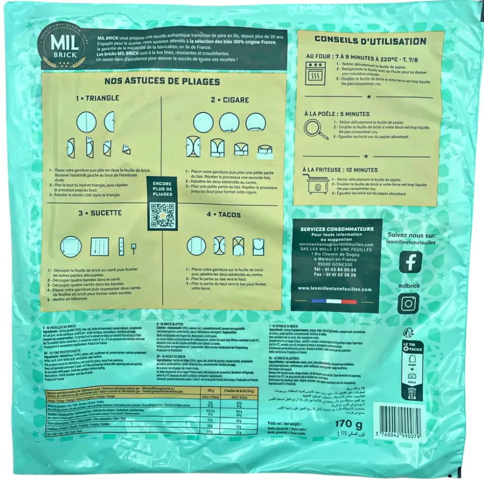 This very thin pastry can easily be folded to make samosas or spring rolls. Traditionally used for a “brick a l’oeuf” (brick with egg) or pastilla, a savoury and sweet pie with meat and nuts covered with crispy layers of brick sheets, brick pastry is very versatile and is perfect for a quick dinner by simply making parcels with meat, fish, vegetables, cheese and more.