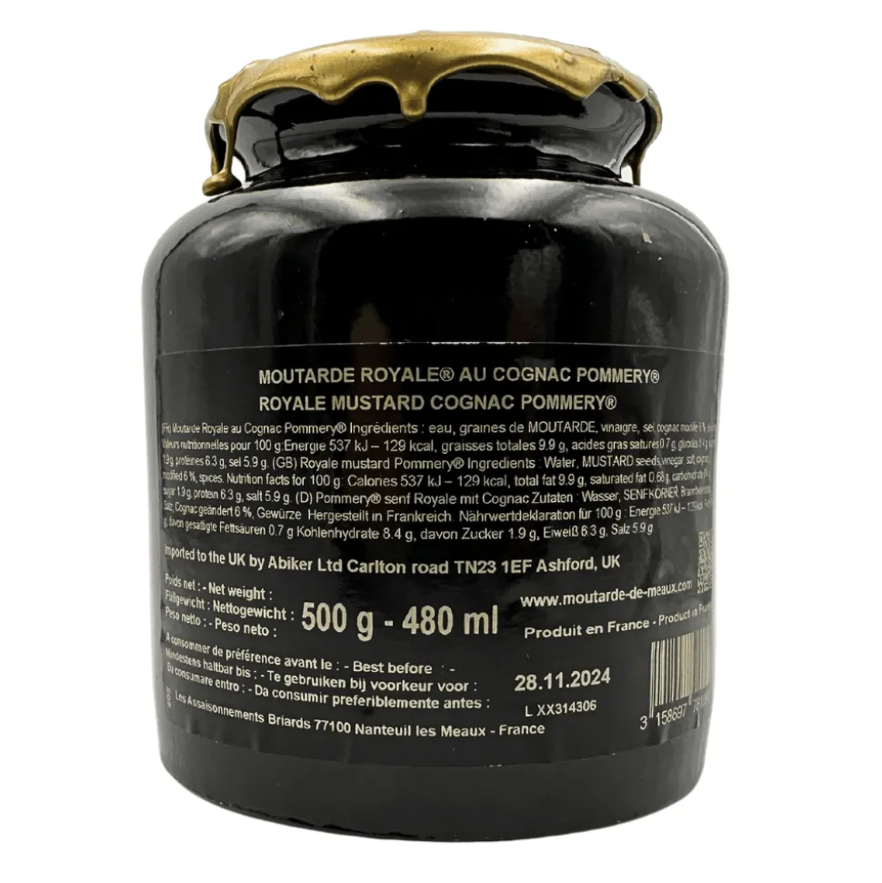Pommery Royale mustard with cognac is a wholegrain mustard with a very distinct flavour thanks to its spices, which are a wonderful compliment to the cognac’s aroma. It is the perfect sauce with game birds or roasted meat and fits perfectly with festive meals.