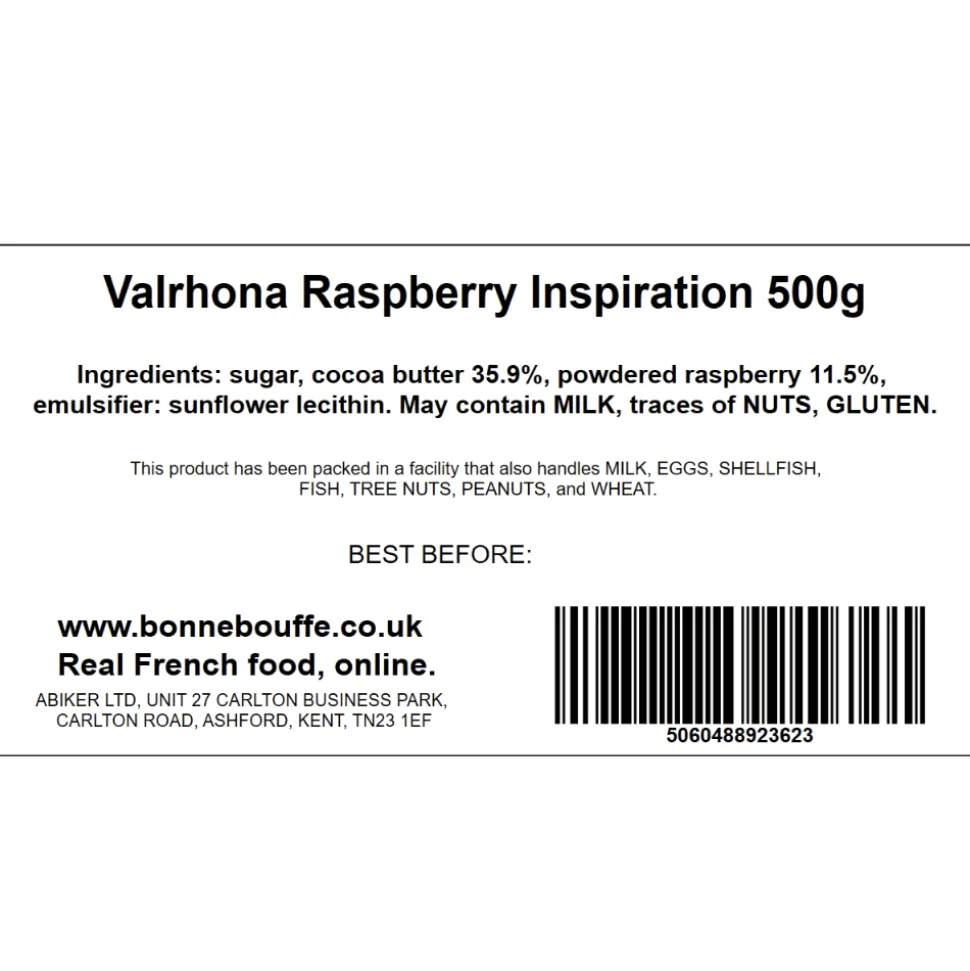 Raspberry Inspiration 500g resealable bag from luxury French chocolate house Valrhona. Valrhona Raspberry Inspiration is a naturally dairy-free product made with cocoa butter and raspberry that can be used in the same way you’d use chocolate. Perfect for all dessert applications like chocolate making, mousse, ganache…