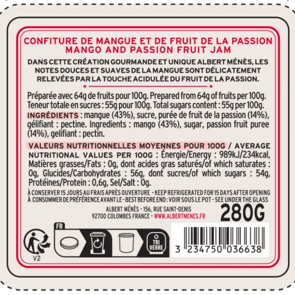 Ingredients: mango (43%), sugar, passion fruit puree (14%), gelling agent: pectin.
