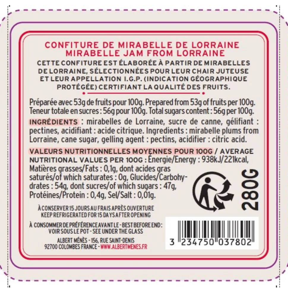 Ingredients: mirabelle plums from Lorraine, cane sugar, gelling agent : pectins, acidifier : citric acid.
