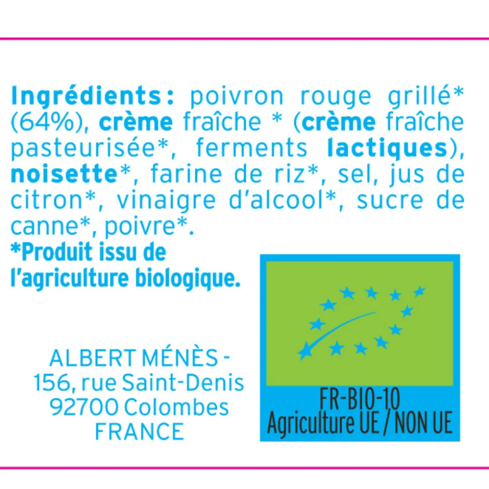 Ingredients: grilled red pepper (64%), fresh CREAM (pasteurised fresh cream, LACTIC ferments), HAZELNUT, rice flour, salt, lemon juice, spirit vinegar, cane sugar, pepper
