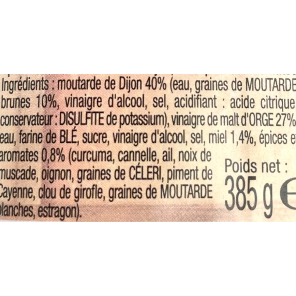 Ingredients – Dijon mustard 40% (water, brown MUSTARD seeds 14%, alcohol vinegar, salt, acidifier: citric acid, preservative: E224 (SULPHITES)), malt vinegar (BARLEY) 27%, water, WHEAT flour, sugar, alcohol vinegar, salt, honey 1.4%, spices and aromatics 0.8% (turmeric, cinnamon, garlic, nutmeg, onion, cayenne pepper, CELERY seeds, cloves, MUSTARD seeds white, tarragon)