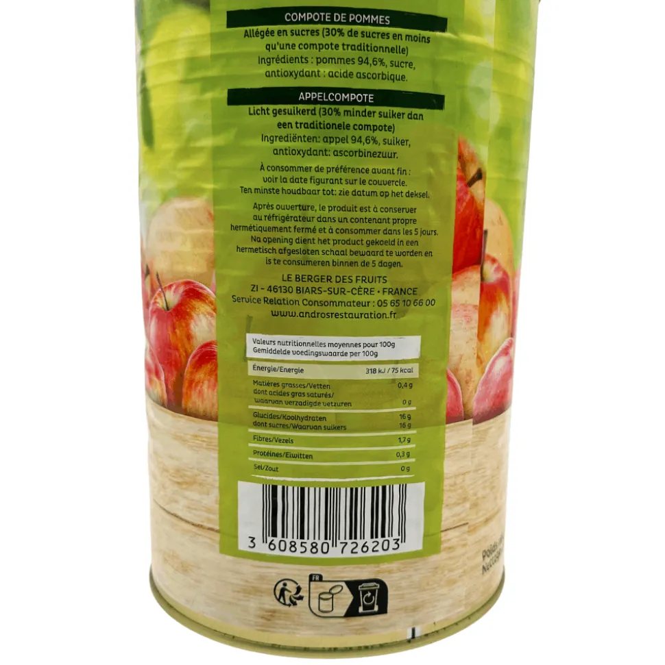 This apple compote is a light blend of pureed apples cooked down with just the right amount of sugar to create a versatile sauce or side dish. Made in France, and with 30% less sugar than traditional compotes, this catering-size tin is ideal for professionals, caterers, and home cooks.