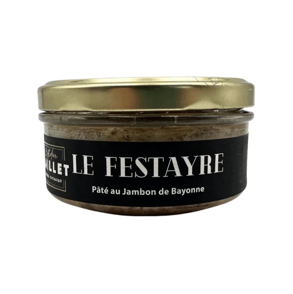 Baillet pork terrine with Bayonne ham PGI ‘Le Festayre’ is a savoury delicacy made in France. This terrine features pork sourced from France, complemented by the renowned Bayonne ham, known for its exceptional flavour. Bayonne ham’s uniqueness lies in its rich, salty flavour profile, derived from the Basque region’s climate and traditional curing process, which imparts a distinctive, delicious taste.