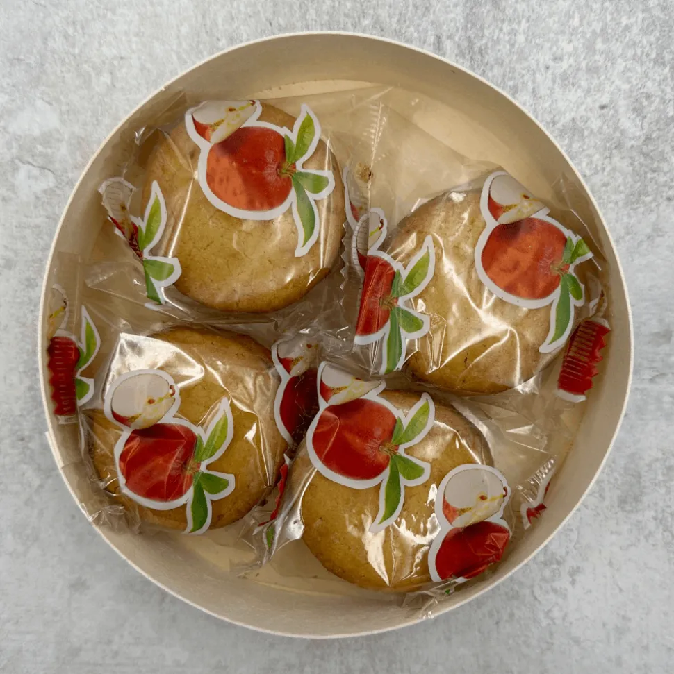 The attractive round wooden box makes this product a great choice for a gift for your loved ones. The packaging is a nod to cheese packaging, particularly camembert or brie. Each container holds 4 sachets of 4 pure butter biscuits with a buttery texture with the freshness of apples and cream.