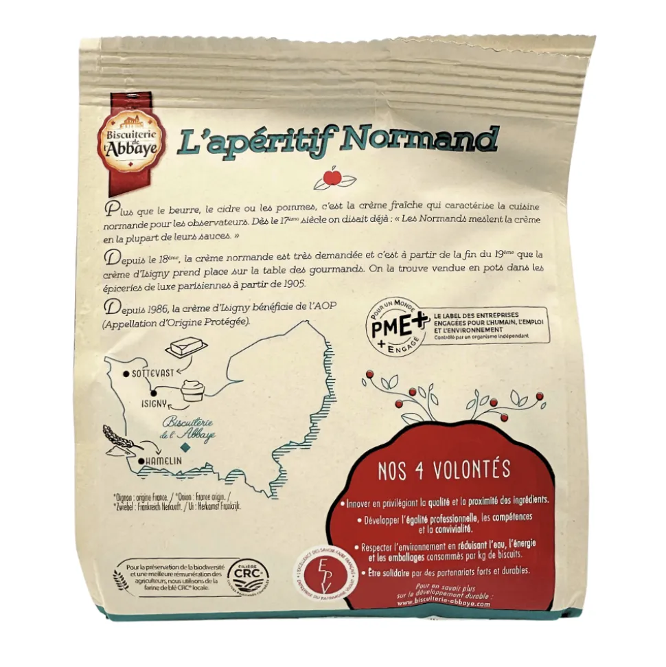 Biscuiterie de l’Abbaye, renowned for its biscuits, has created a selection of savoury biscuits for the aperitif. The dough contains the finest authentic ingredients from Normandy, including the butter, onion and Isigny A.O.P creme fraiche.