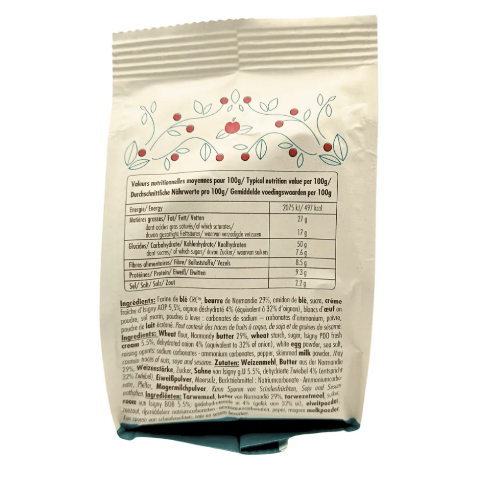 Ingredients: CRC WHEAT flour , Normandy BUTTER 29%, WHEAT starch, sugar, Isigny AOP CREME FRAICHE 5.5%, dehydrated onion 4% (equivalent to 32% onion), EGG whites powder, sea salt, raising agents: sodium carbonates – ammonium carbonates, pepper, skimmed MILK powder. Onion: origin France. May contain traces of NUTS, SOY and SESAME SEEDS.