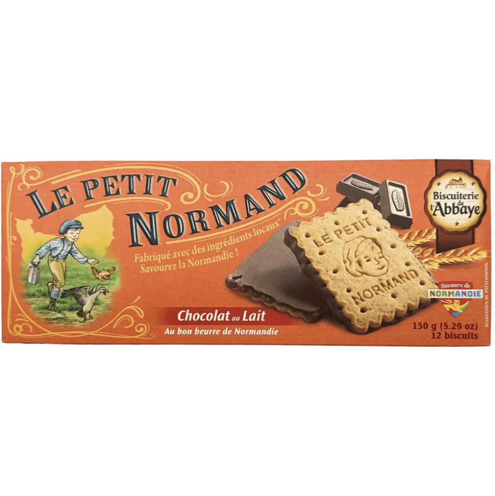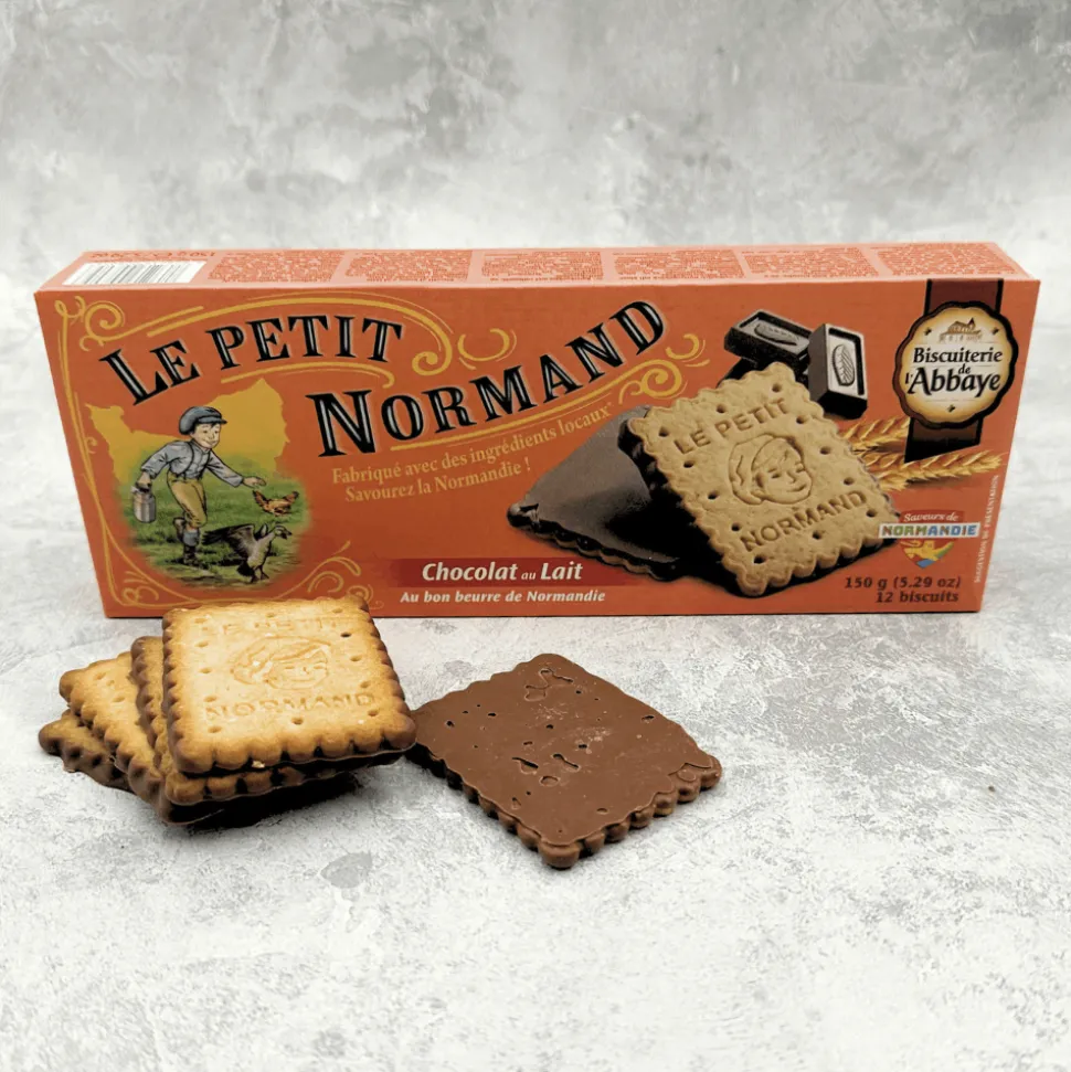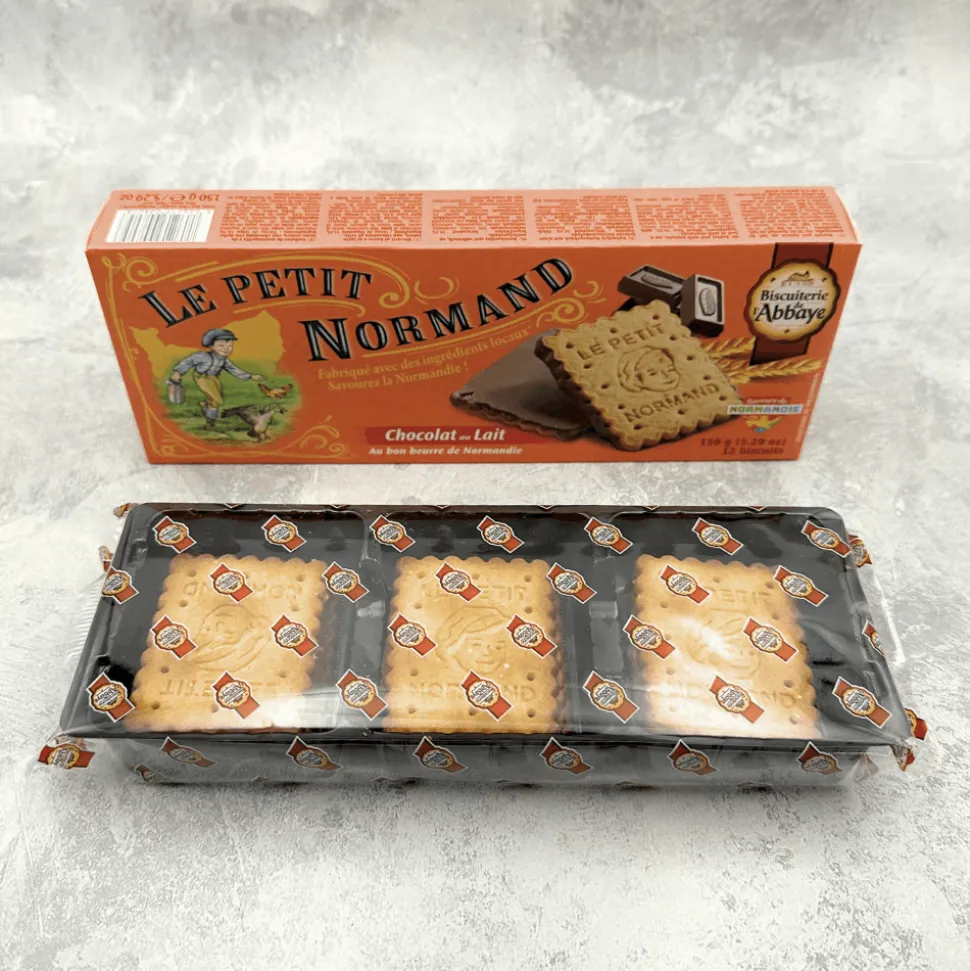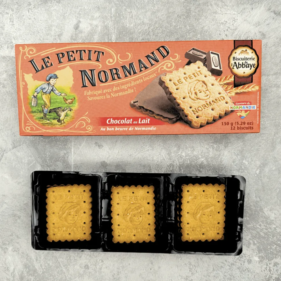 Introducing le petit Normand with milk chocolate – a delightful local biscuit by Biscuiterie de l’Abbaye. These treats are made with the finest ingredients, including butter and milk sourced from Normandy.