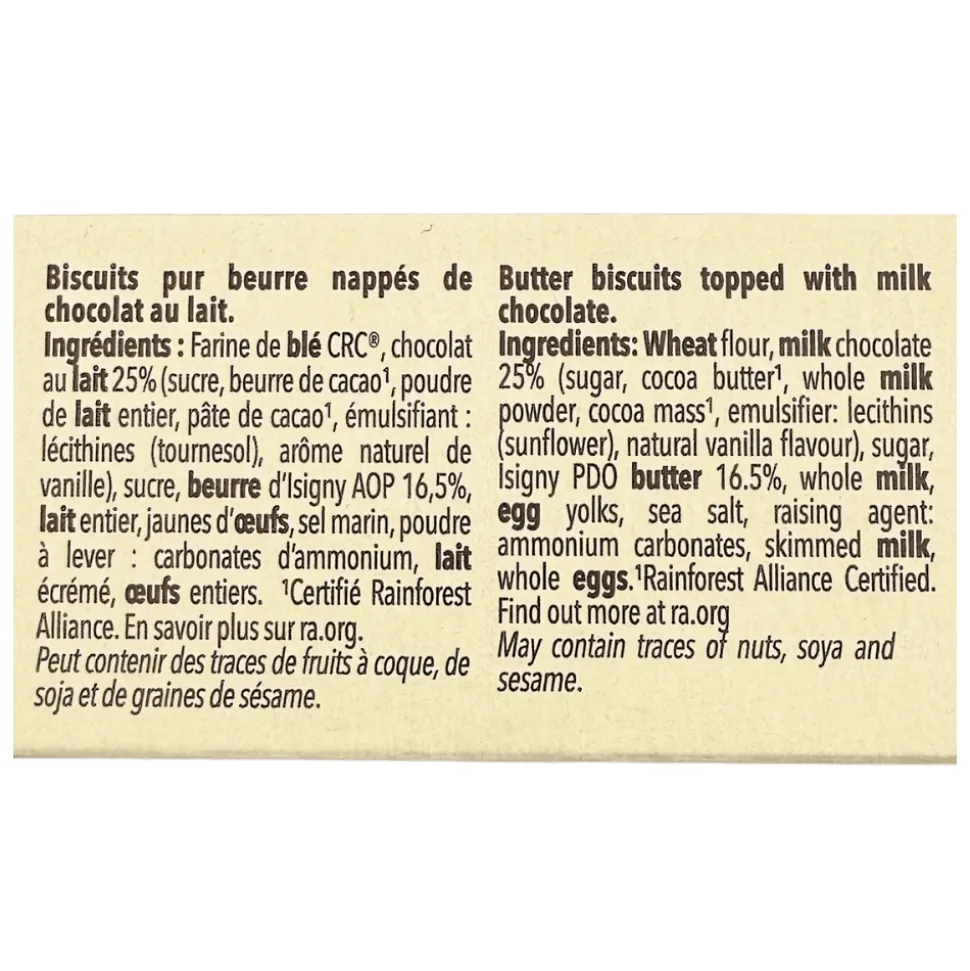 Each pack contains 4 sachets, with 4 biscuits made from Isigny P.D.O. butter and generously topped with velvety milk chocolate. Keep these biscuits in a cool, dry place to preserve their freshness and delightful texture.