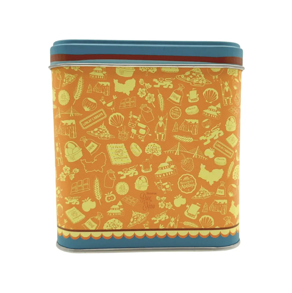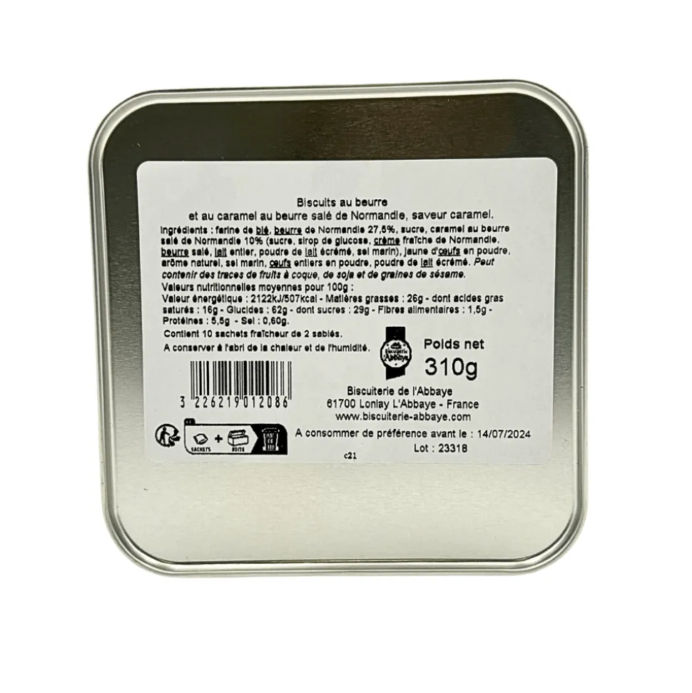 This large metal gift box contains 10 sachets of 2 butter and salted caramel biscuits from Normandy. These classic, buttery, crumbly sable biscuits are made using a traditional recipe that features butter, salted caramel, and creme fraiche all local to Normandy. Salted caramel biscuits features a buttery, crumbly texture that melts in your mouth. The sweetness is perfectly balanced by a hint of salt, creating a simple yet satisfying flavour profile.