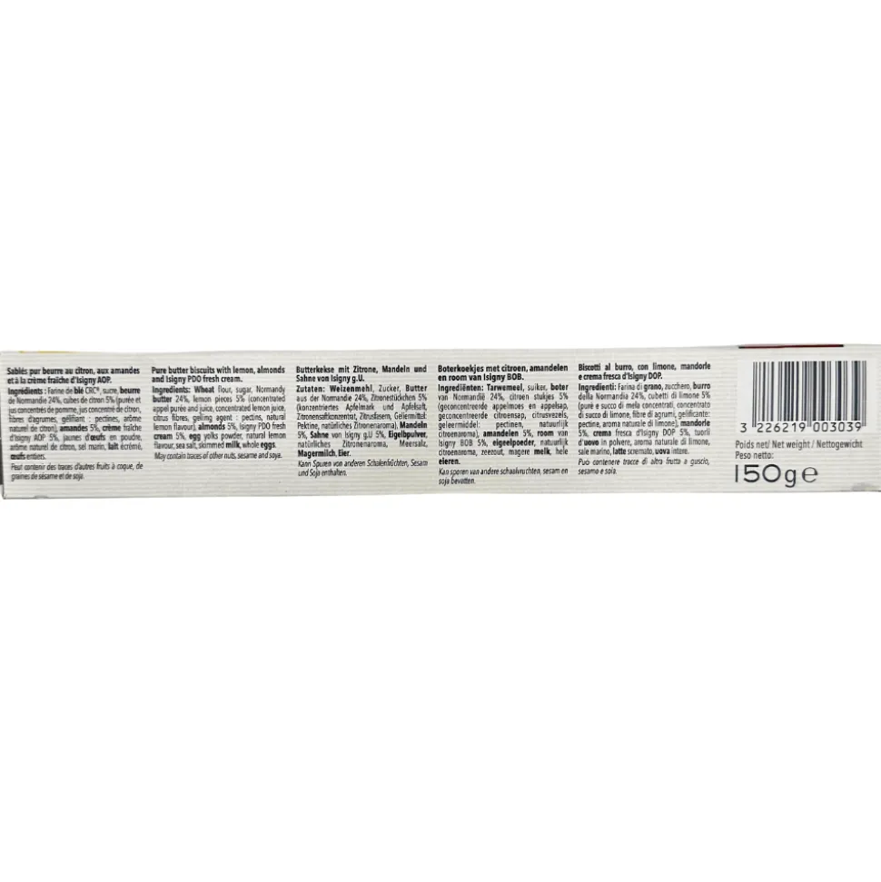 Ingredients – WHEAT flour, sugar, Normandy BUTTER 24%, lemon pieces 5% (apple puree and concentrated juice, concentrated lemon juice, citrus fibres, gelling agent: pectins, natural lemon flavour), ALMONDS 5%, Isigny AOP 5% CREME fraîche, powdered EGG yolks, natural lemon flavour, sea salt, skimmed MILK, whole EGGS. May contain traces of soy, sesame seeds and other nuts.