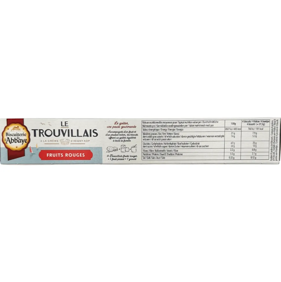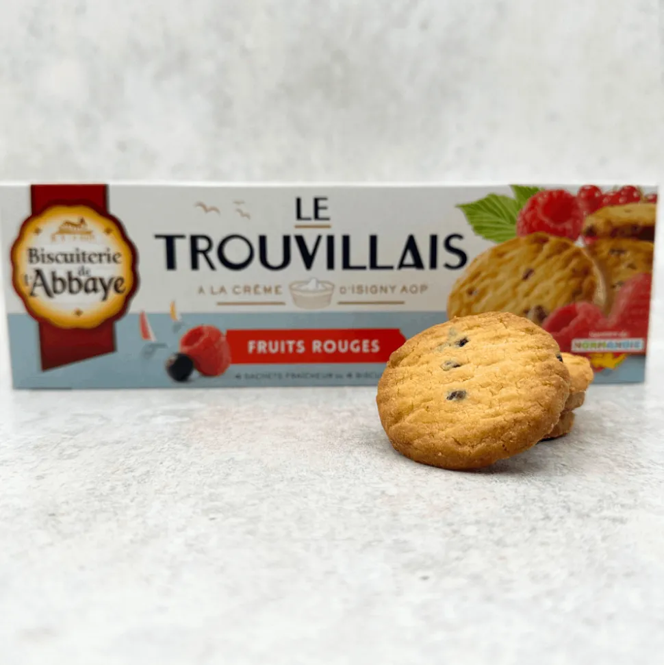 These fruity ‘Le Trouvillais’ biscuits are made with a blend of mixed red berries and fruits, including strawberries, black currants, raspberries, red currants, and cranberries, all within a delicate buttery shortbread-like biscuit dough and fresh Isigny PDO cream.