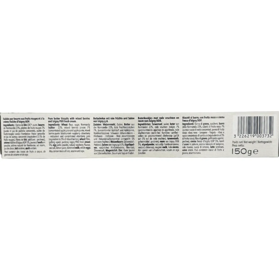 Ingredients – WHEAT flour, sugar, Normandy BUTTER 23%, red fruit pieces 7% (concentrated apple puree and juice, red fruit puree: blackcurrant, strawberry, raspberry, redcurrant and concentrated elderberry juice (equivalent to 5%), WHEAT fibers, gelling agent: pectins), Isigny PDO CREME fraîche 5%, powdered EGG yolks, natural raspberry flavor, sea salt, lemon juice, skimmed MILK, whole EGGS. May contain traces of nuts, soy, sesame seeds.