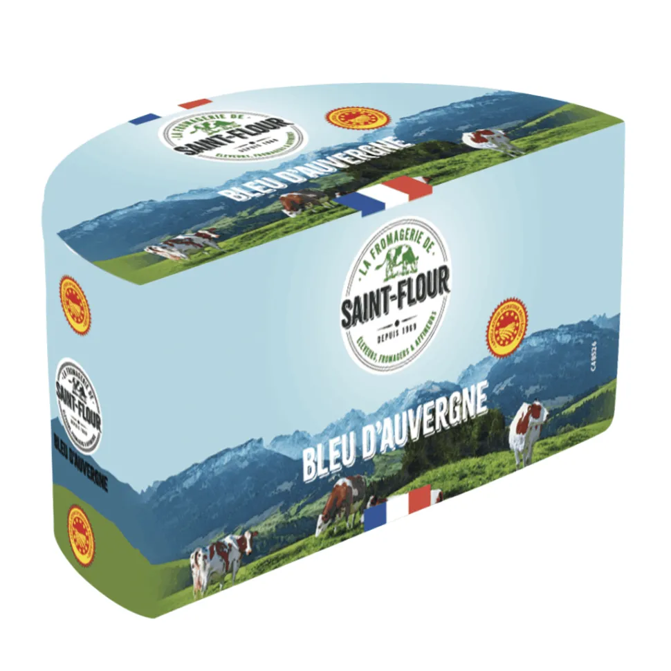 Bleu D’auvergne is extremely versatile. Like Roquefort, it’s a wonderful addition to salad dressings, sauces and tarts. You can also crumble it into salads or simply enjoy it alone. It pairs equally well with a sweet dessert wine and with a robust and fruity red. This Bleu D’auvergne is produced by the dairy cooperative Saint-Flour, founded in Auvergne in 1969.