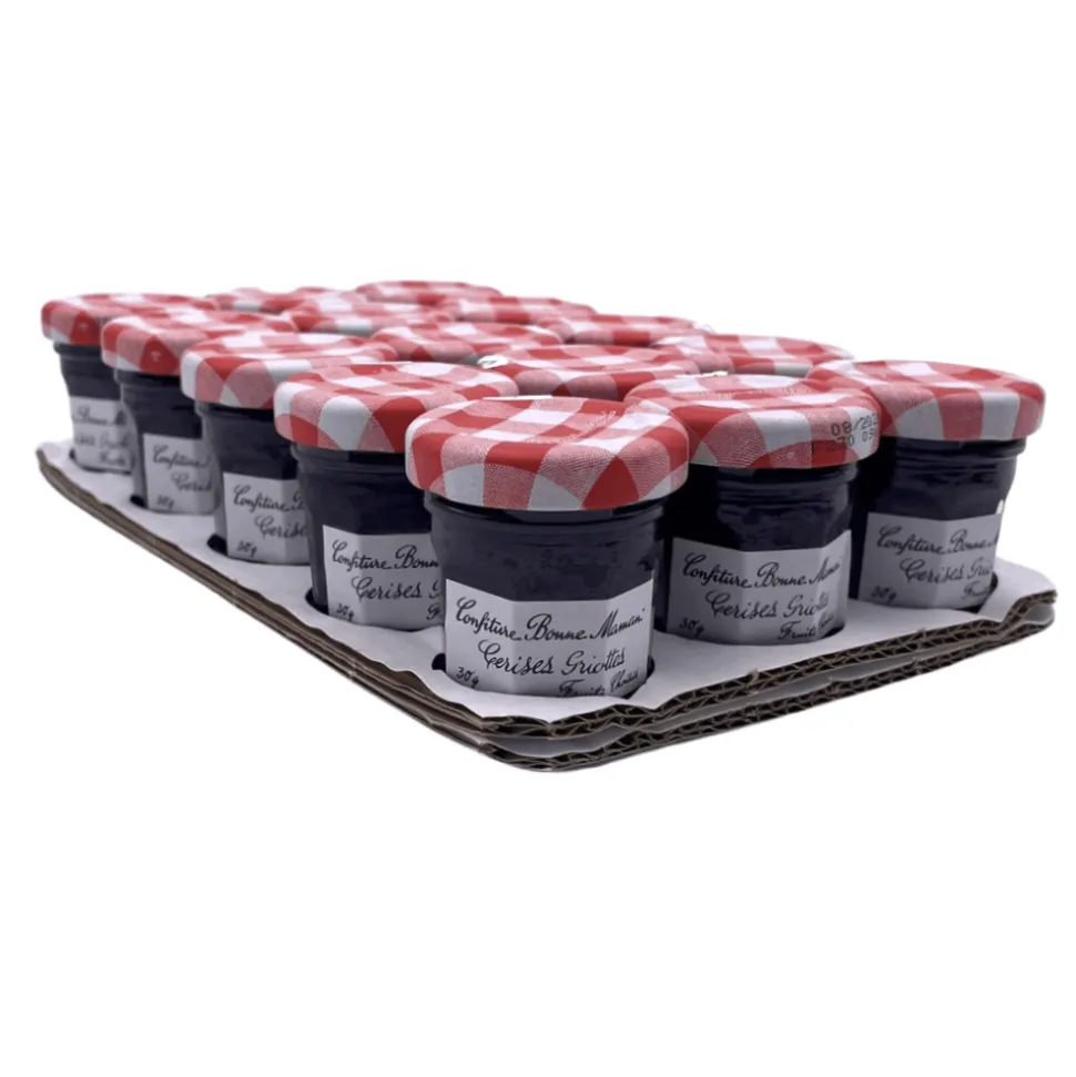 Mini cherry jam jars from French company Bonne Maman, founded in 1971 in Southwest of France, a region known for great quality fruits, the perfect base for a preserves factory. Perfect for breakfast to spread on toast or some fresh brioche or baguette. It’s a great gift as well for any jam lover.