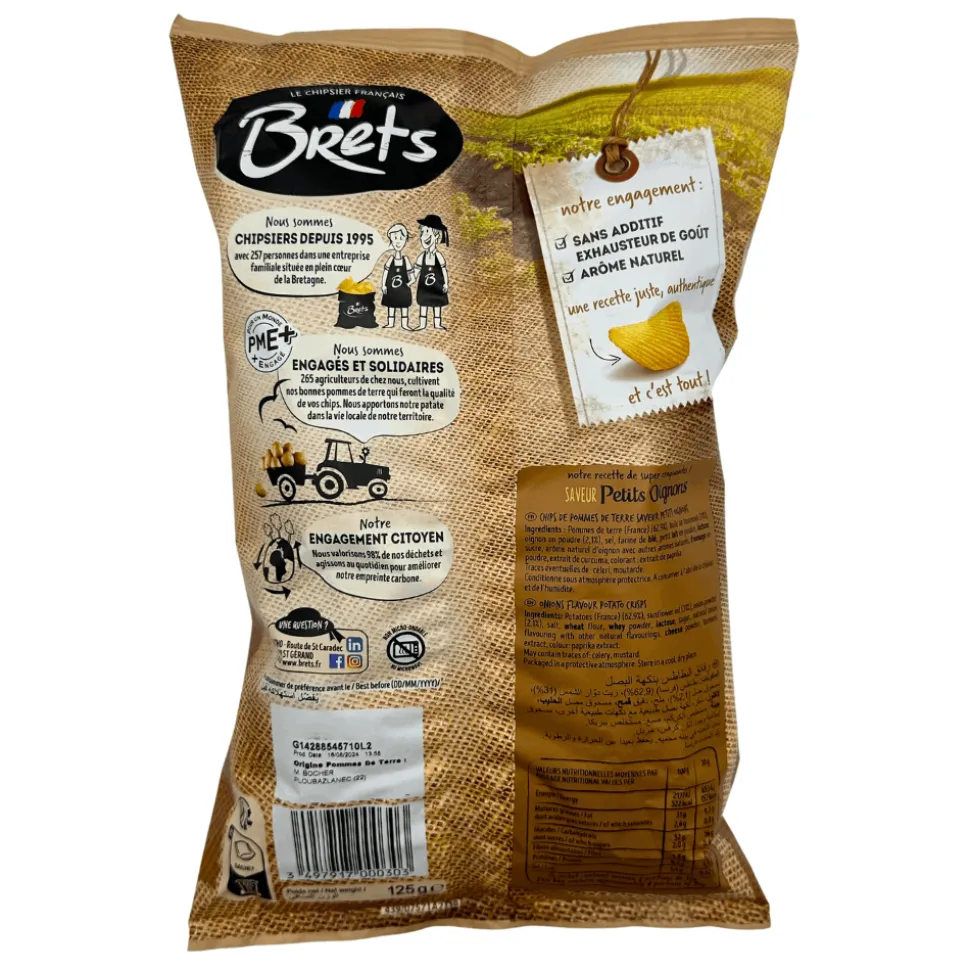 Bret’s onion crisps are crisps crafted in Brittany using high-quality local ingredients like French potatoes, without preservatives or artificial flavours. Seasoned with natural flavours, these crunchy crinkle crisps are packaged promptly to maintain their freshness and texture, capturing the essence of Brittany’s gastronomy.