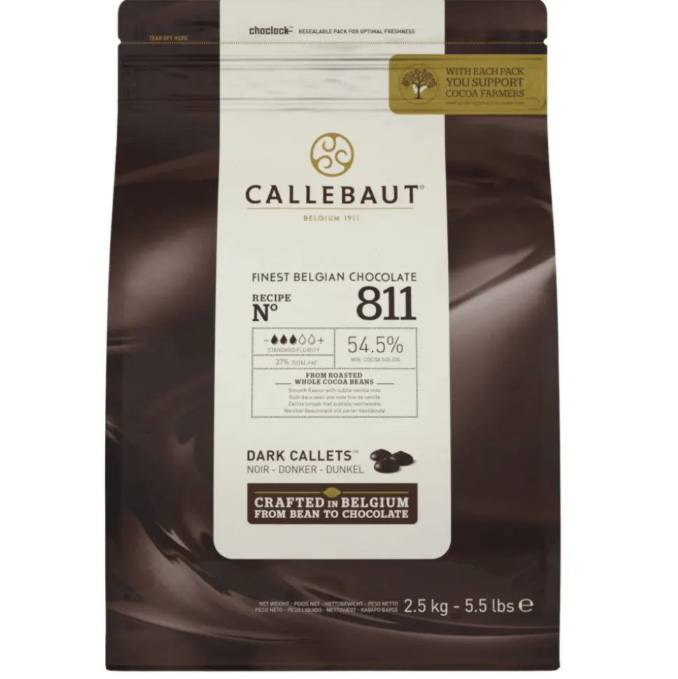 Barry Callebaut dark chocolate chips in a resealable, 2.5kg bag. This dark Belgian chocolate has a 54.5% cocoa content.