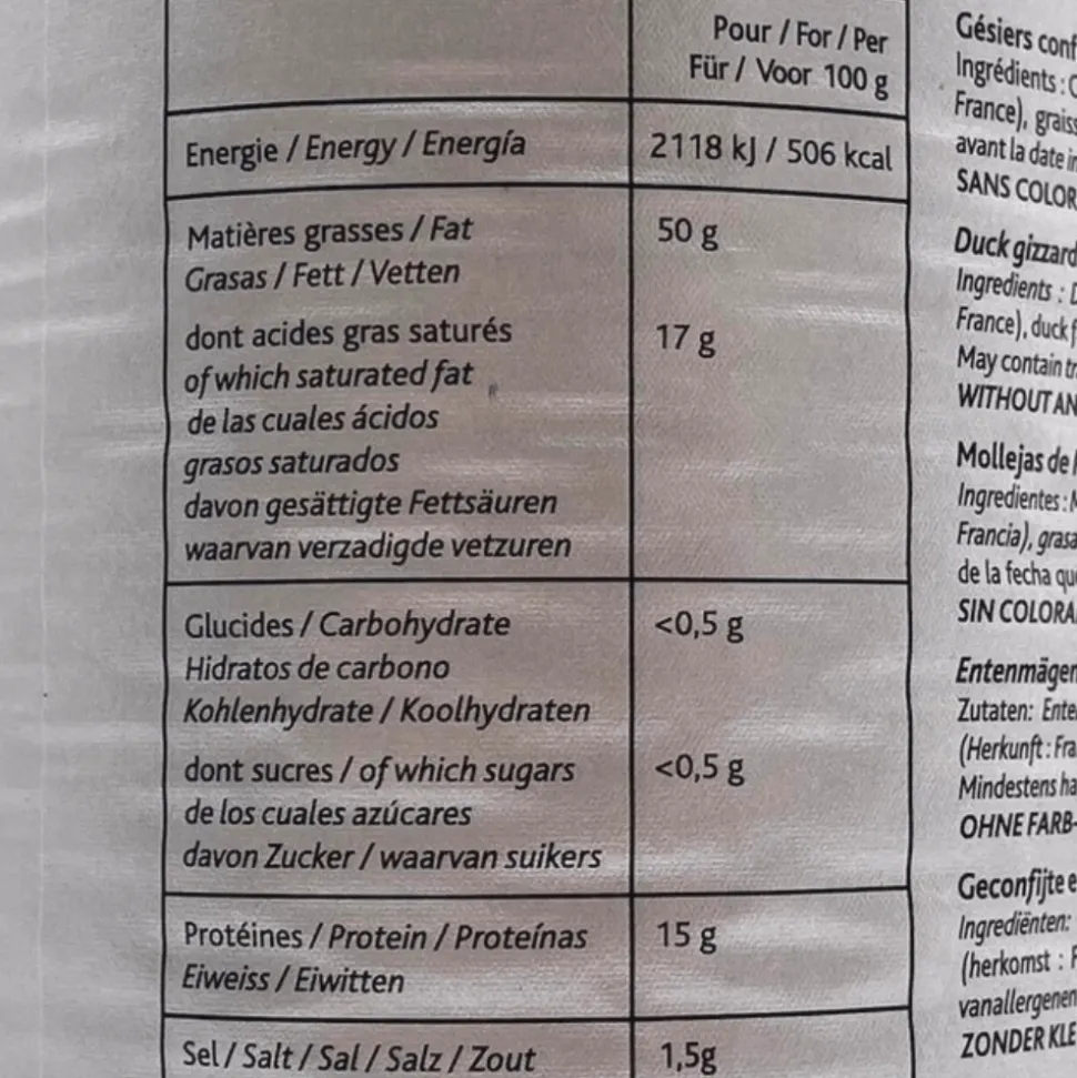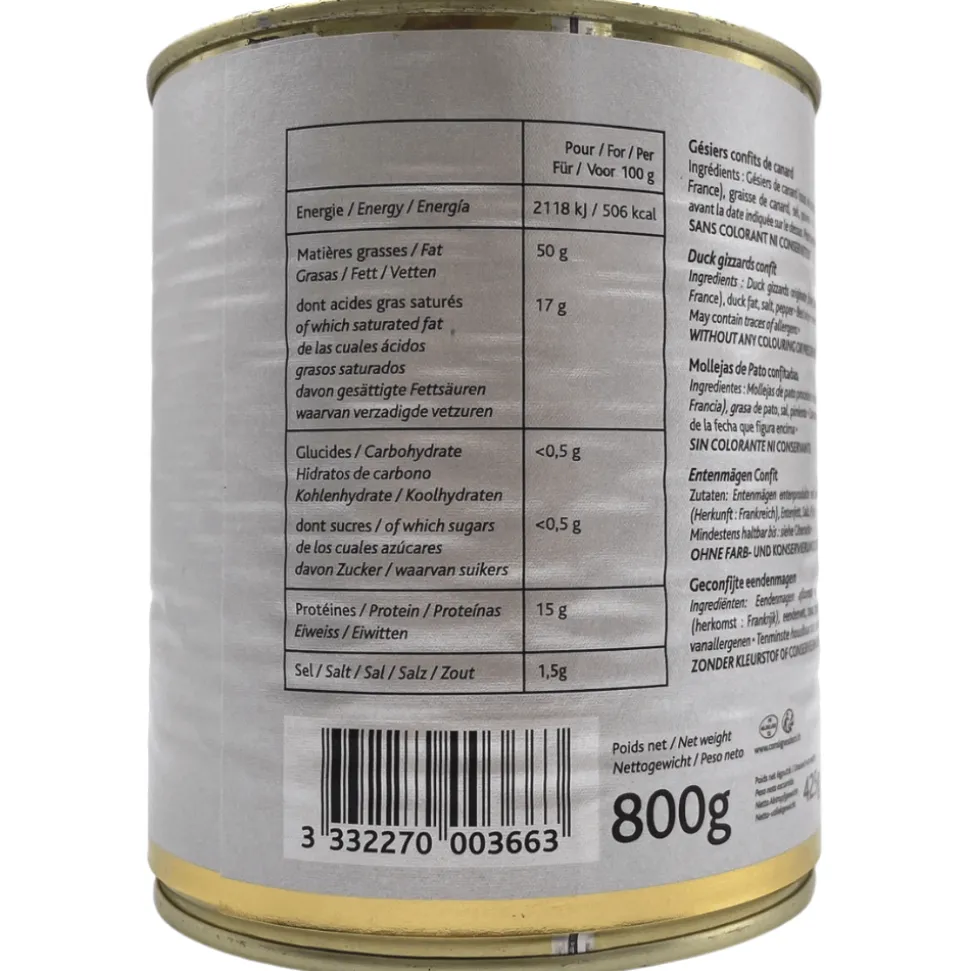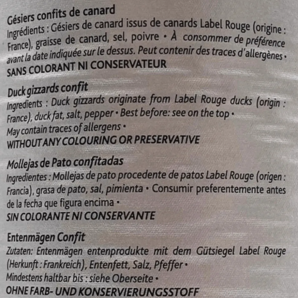 Ingredients: duck gizzards (Label Rouge, origin: France), duck fat, salt, pepper.