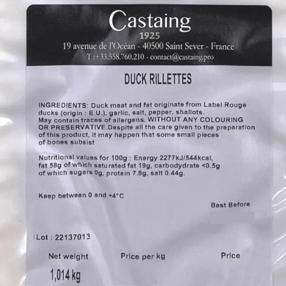 Ingredients: duck fat and meat (origin: France), garlic, salt, pepper, shallots.