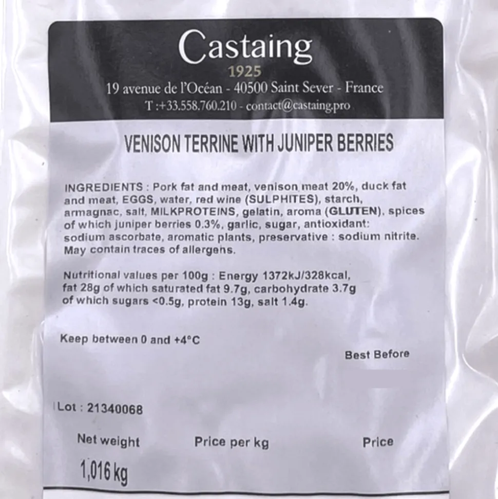 Ingredients: pork meat and fat (origin: France), venison meat (origin: EU) 20%, duck fat (origin: France), EGGS, water, red wine (SULPHITES), starch, Armagnac, salt, MILK proteins, gelatin, flavors (GLUTEN), spices including juniper berries 0.3%, garlic, sugar, antioxidant: sodium ascorbate, aromatic plants, preservative: sodium nitrite.