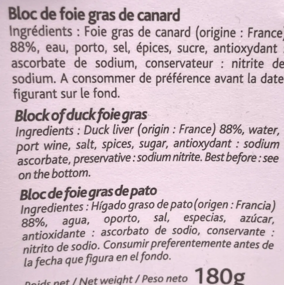 Ingredients: duck liver 88%, water, Port wine, salt, spices, sugar, antioxidant: sodium ascorbate, preservatives: sodium nitrite