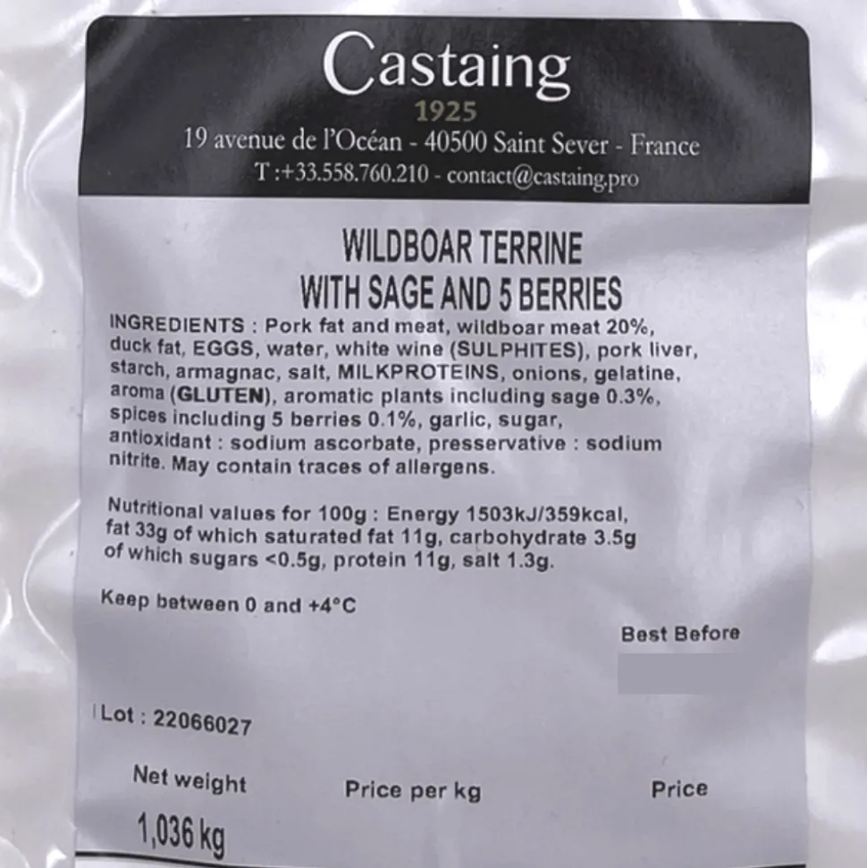 The powerful taste of wild boar is what stands out in this terrine. You will be won over by this rich and subtle pâté from traditional French producer Castaing. Here, the distinctive flavour of boar is softened and rounded out with fragrant sage and a mix of five berries.