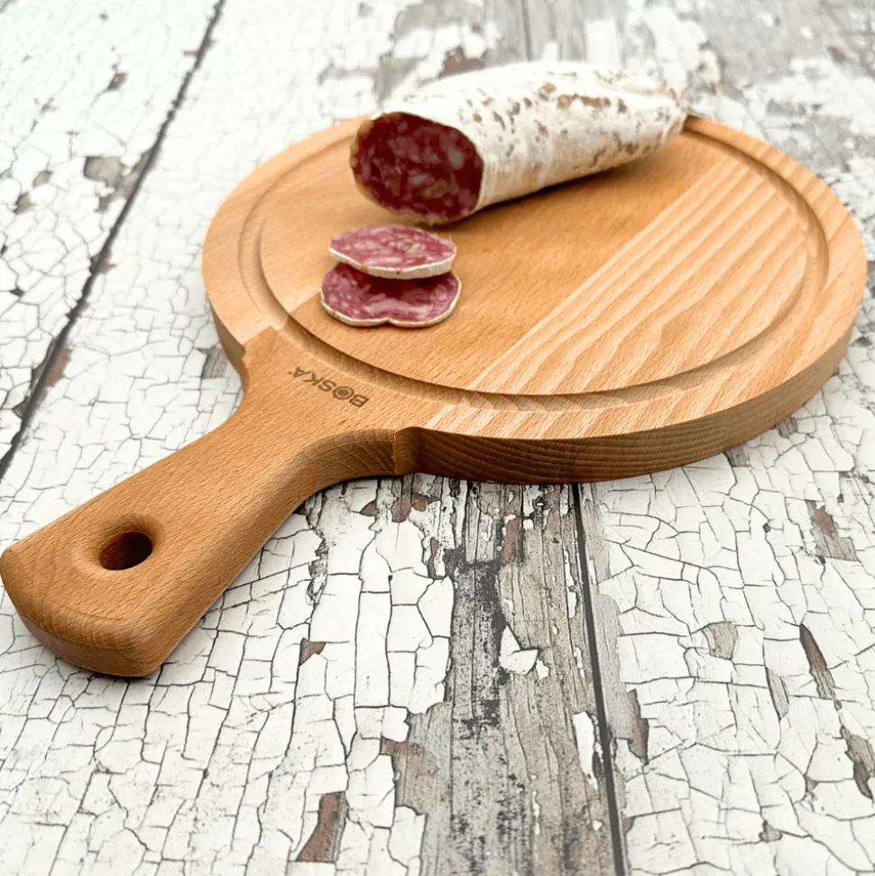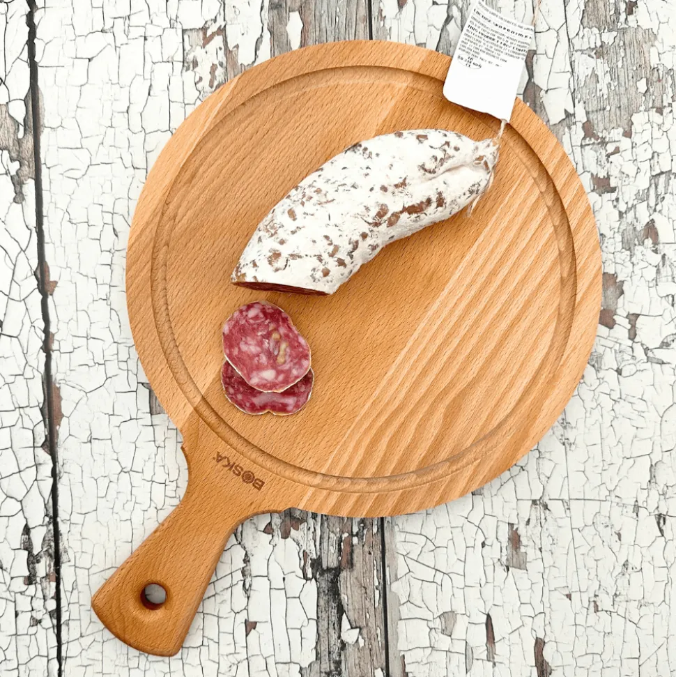 To enjoy this saucisson at its best, just slice it! Peel off the bloomy rind (depending on taste) and enjoy it with fresh French bread, or on its own with a handful of cornichons. Whole saucisson sec keeps extremely well in your kitchen cupboard but should be refrigerated after cutting. For optimal flavour, let it come back to room temperature before serving.