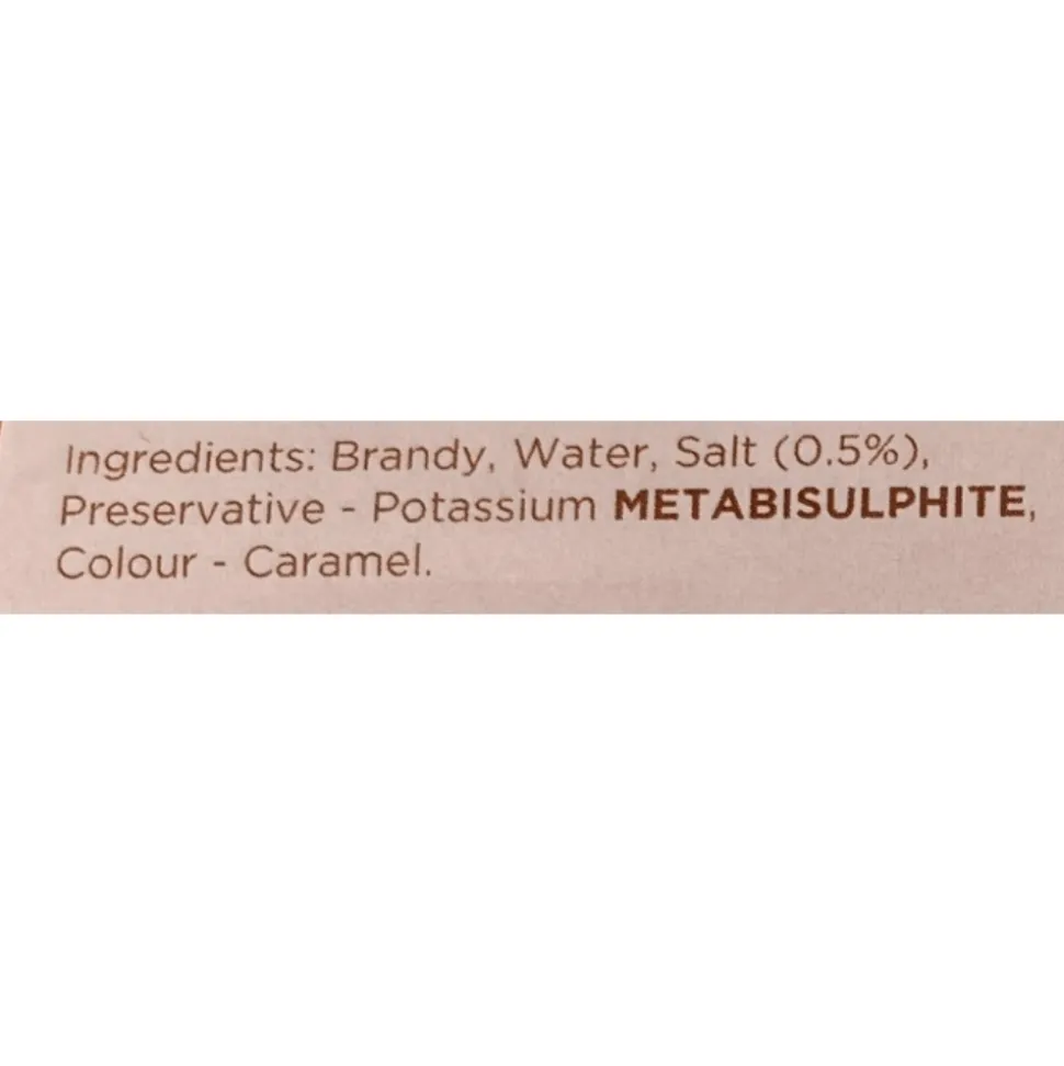 Ingredients – Brandy (51%), Water (48.5%), Salt (0.5%), Preservative – Potassium E220 METABISULPHITE, Colour – E-150d Caramel