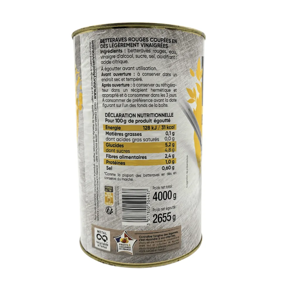 Diced Beetroot in a 4kg catering-sized tin, made in France. Perfectly diced for quick and easy use, this beetroot offers a simple solution to garnish salads, pastas, and vegetable dishes. Add a burst of colour, flavour, and nutrition to your meals. Ideal for professional, catering or home cooks.
