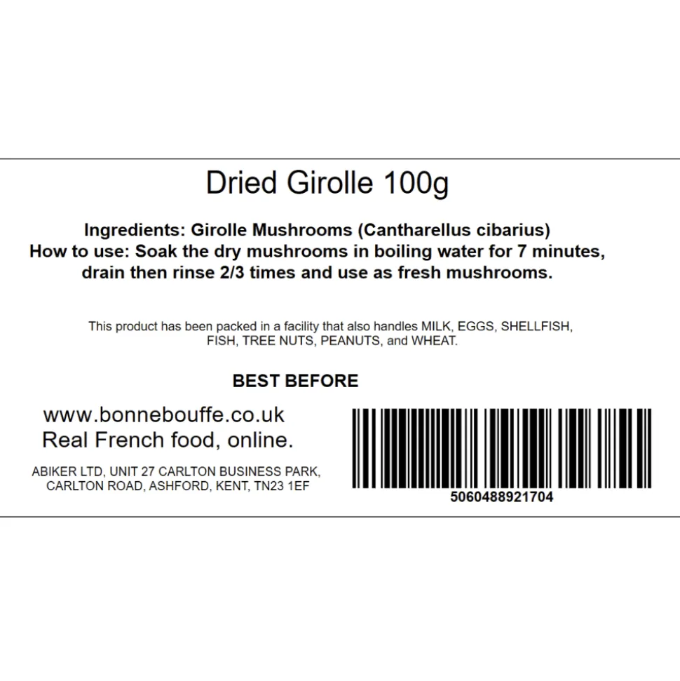 Dry girolles mushrooms, 100g resealable bag, ideal to use in risotto, broths, pasta…Soak the dry mushrooms in boiling water for 7 minutes, drain then rinse 2 or 3 times and use as fresh mushrooms. Girolle mushrooms are golden yellow, with delicious nutty, peppery notes. The wavy caps have a ridged underside, with an enjoyably chewy, slightly fibrous stem. Also known as golden chanterelles, girolles grow in clusters at the foot of woodland trees and are harvested over the summer months.