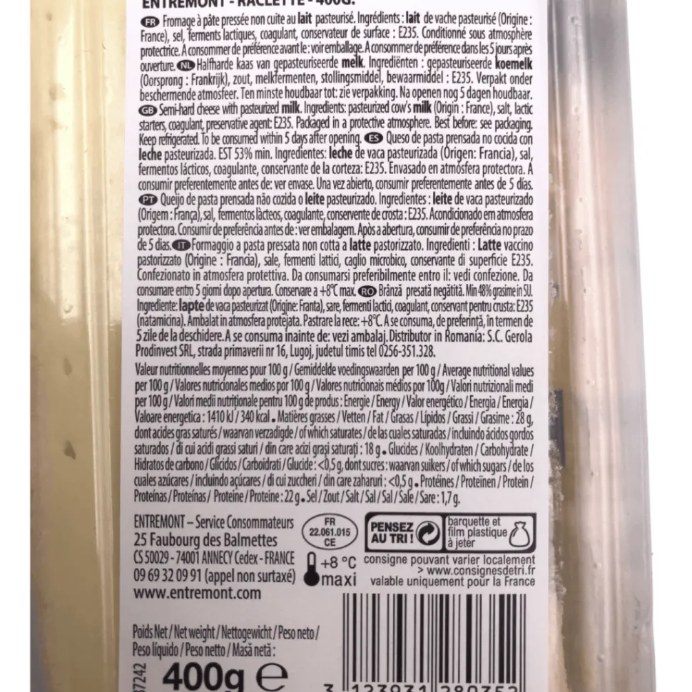 This 400g pack of sliced raclette from French producer Entremont lets you have the mountain chalet experience in your own home. Just heat the raclette until it’s bubbling, using a skillet, oven dish or special raclette grill. The traditional accompaniment to raclette is white wine, usually from the Savoie region. But if you are after something a bit different why not try a burger with raclette on the barbecue or a quiche with raclette, Monbeliard sausages and Roscoff onions, now that’s a special recipe!