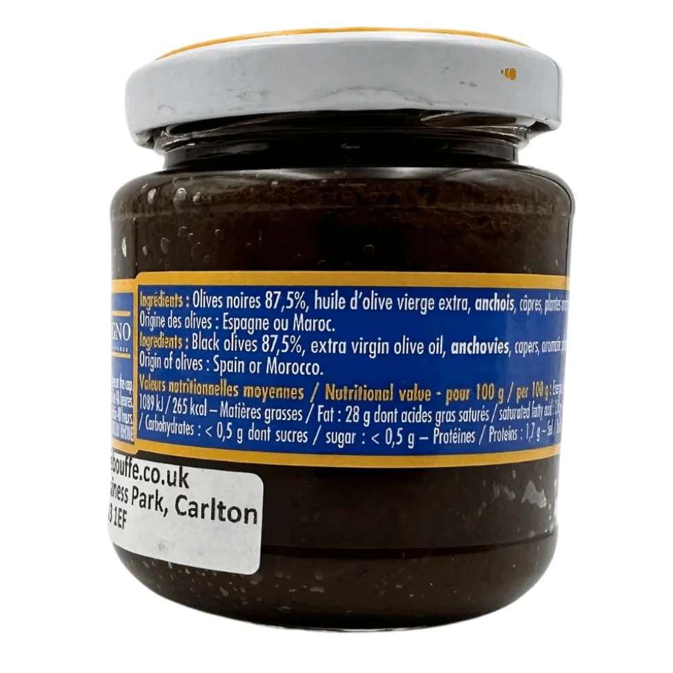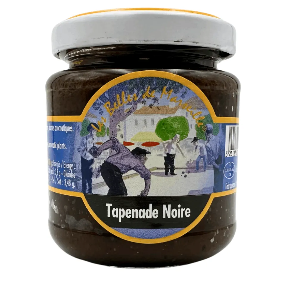 Black olive tapenade, a savoury spread from Provence, France, is made from chopped olives, capers, anchovies, and olive oil. Its texture is smooth but with a slightly coarse consistency due to the chopped ingredients. Enjoy this condiment on bread or as a topping for meats and fish. Its robust flavour pairs perfectly with cheeses, antipasti platters or charcuterie boards and adds a Mediterranean touch to any dish.