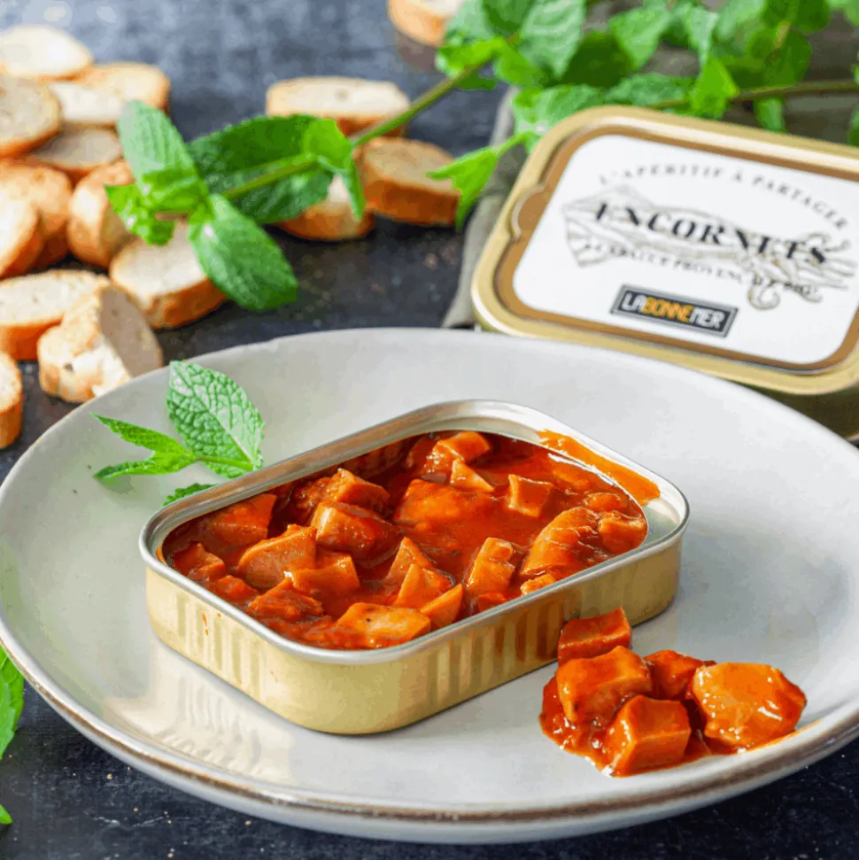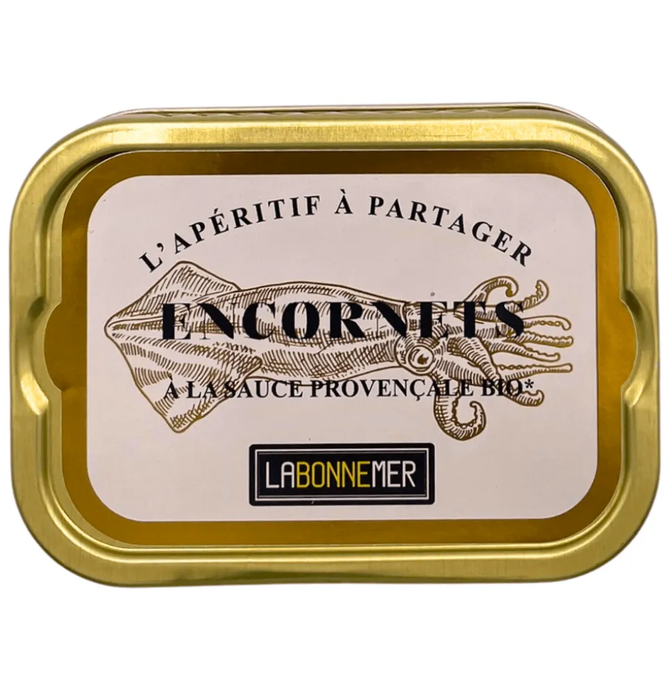 Provencale squids or “Encornets à la Provençale” is a delectable seafood delicacy that captures the vibrant flavour of the Provençal region in France. This culinary delight consists of tender squid, cooked and preserved in a tin, along with a flavourful blend of Mediterranean-inspired ingredients. The traditional recipe often includes olive oil, garlic, tomatoes, onions, aromatic herbs like thyme and rosemary, as well as a touch of tanginess from lemon juice or white wine.