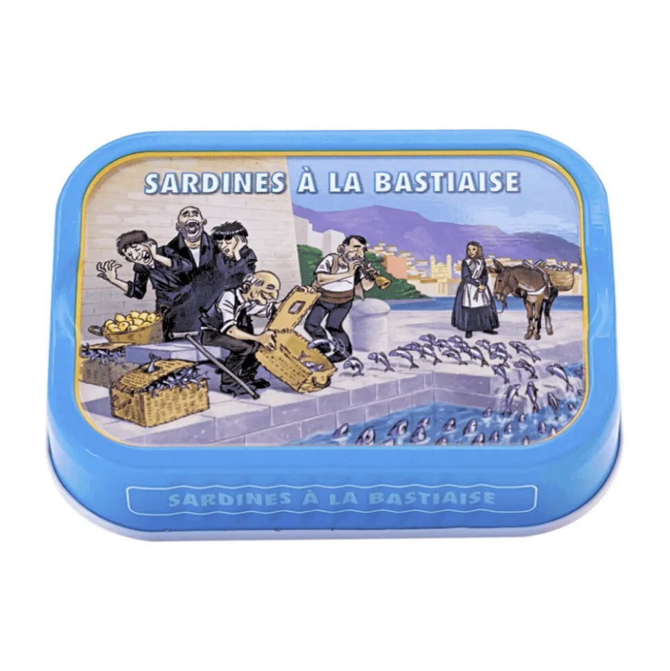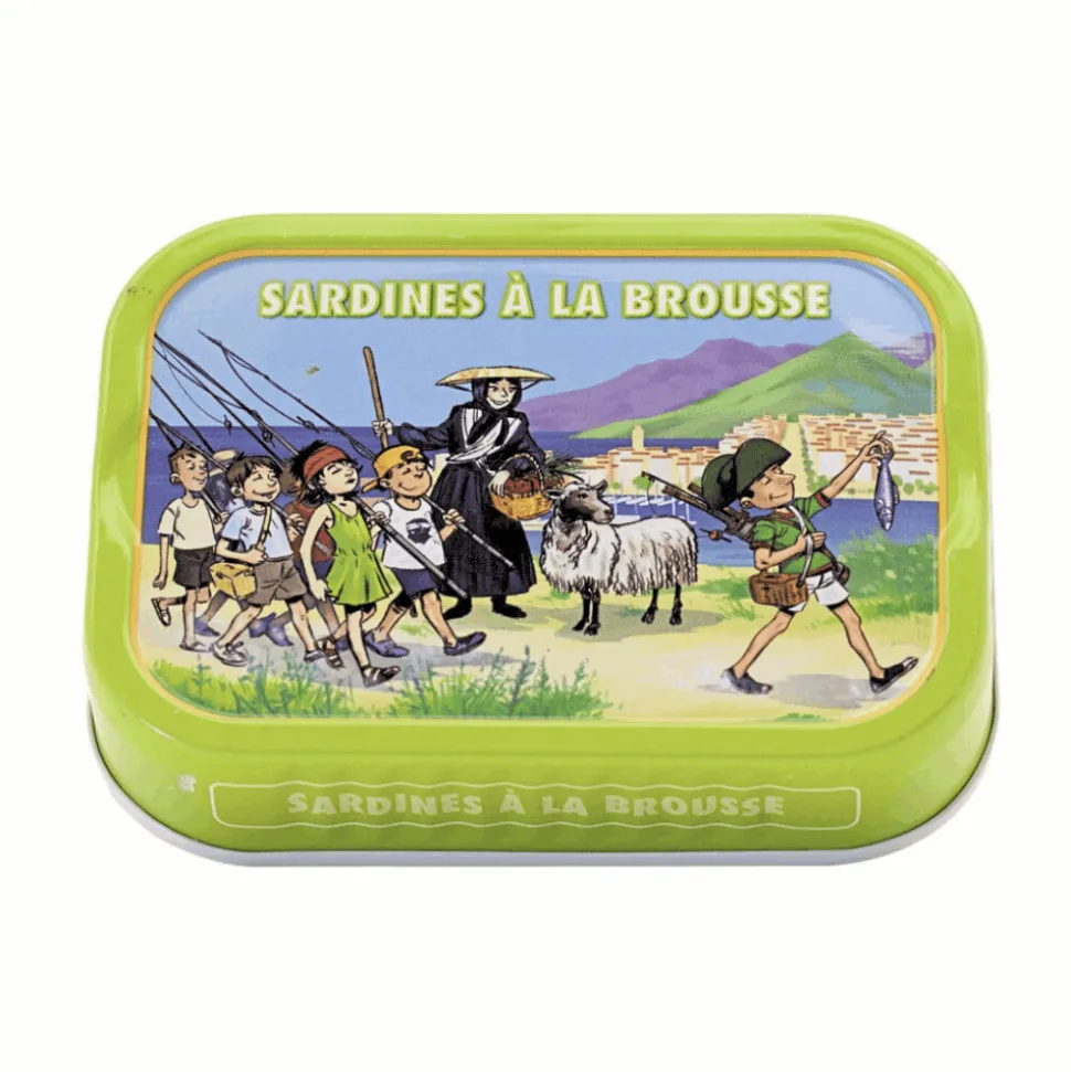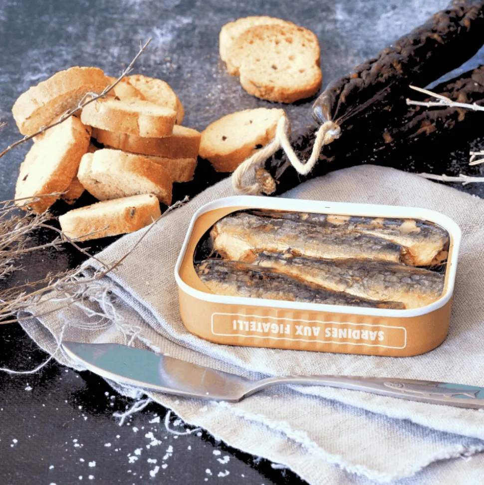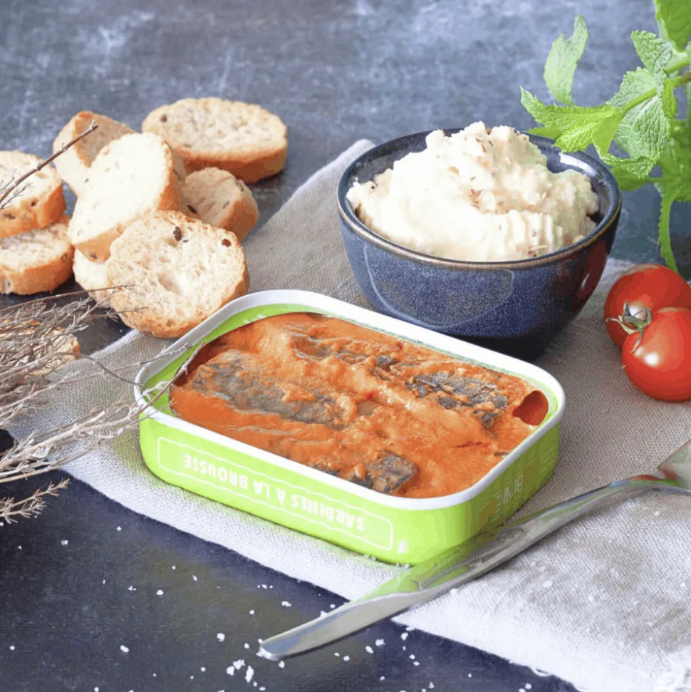 -Sardines with “brousse”115g: This tin features sardines with herbs, garlic, olive oil and brousse cheese. Brousse is a fresh cow’s milk cheese common in Corsica.