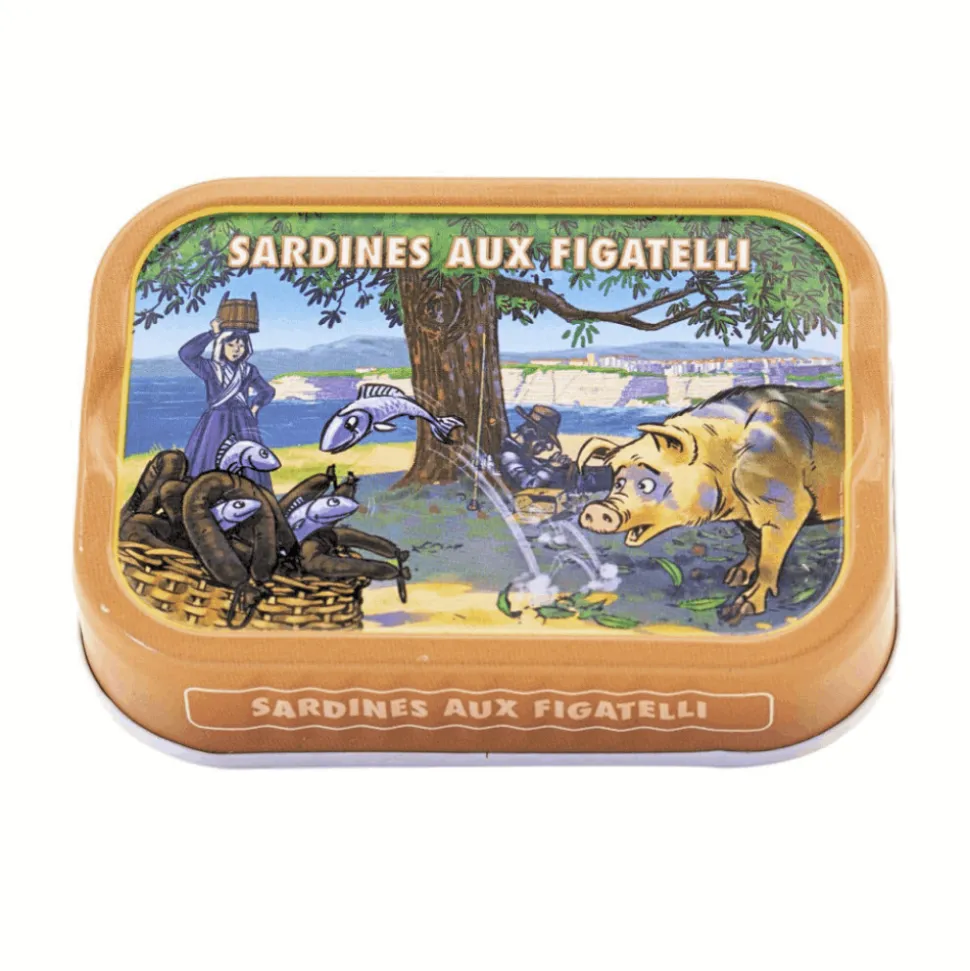 -Sardines with “figatelli” 115g: Figatelli is a type of Corsican sausage made from pork liver and seasoned with various herbs and spices.