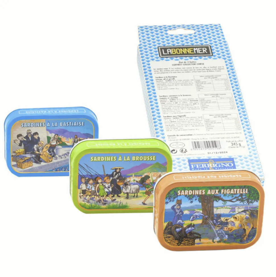 This sardine selection features three tins of sardines with the flavours of Corsica, including: