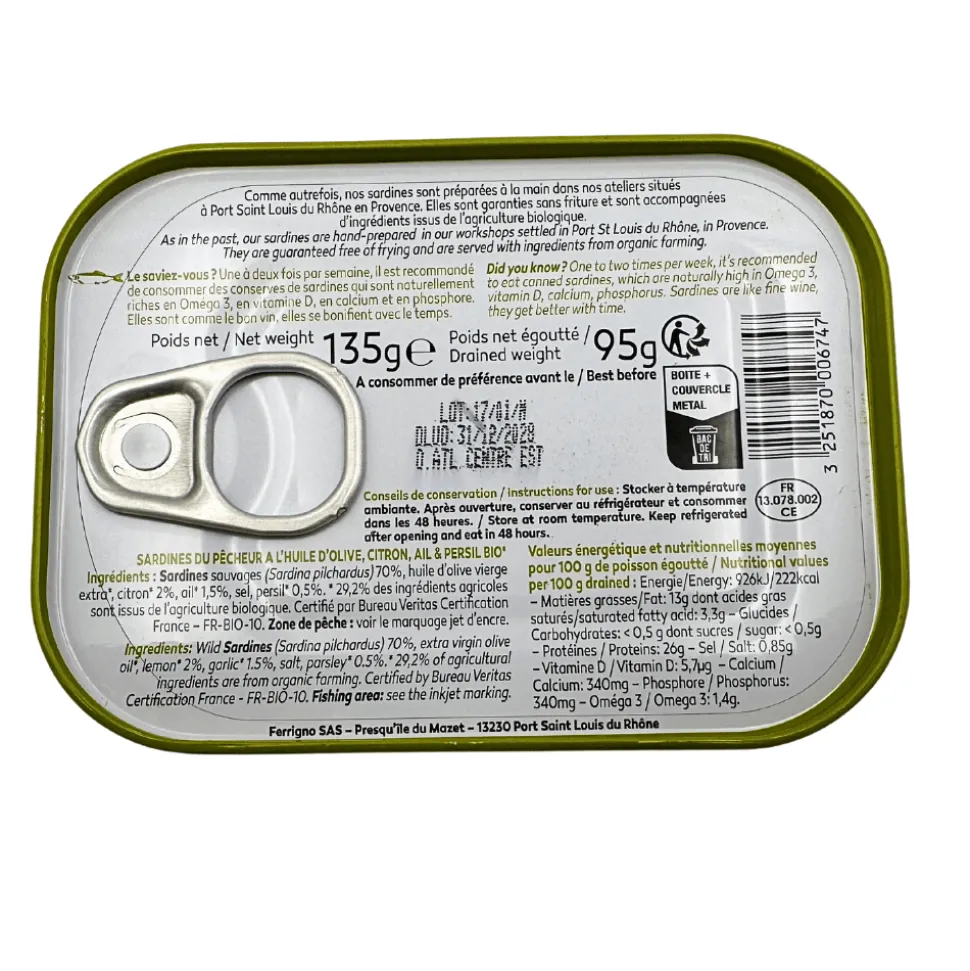 According to traditions, wild sardines are hand-prepared and put on grids for steam-cooking in Ferrigno workshops based in Port Saint Louis du Rhone in Provence. They are guaranteed free of frying and are prepared with carefully selected ingredients. Sardines are like fine wine, they get better with time!