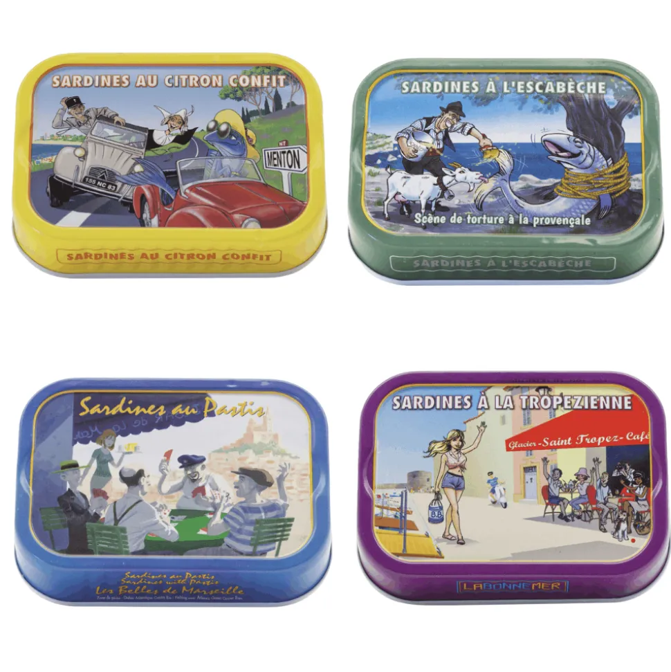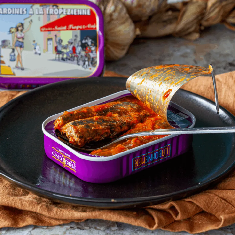• Sardines Tropezienne 115g: tinned sardines with Provence flavours: capers, onions, pepper, tomatoes, garlic, black olives, and extra virgin olive oil.
