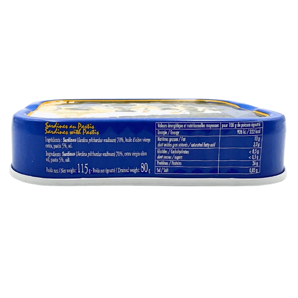 • Sardines With Pastis 115g: tinned sardines with olive oil and the famous French drink Pastis, with slight notes of anise, liquorice, and herbs.