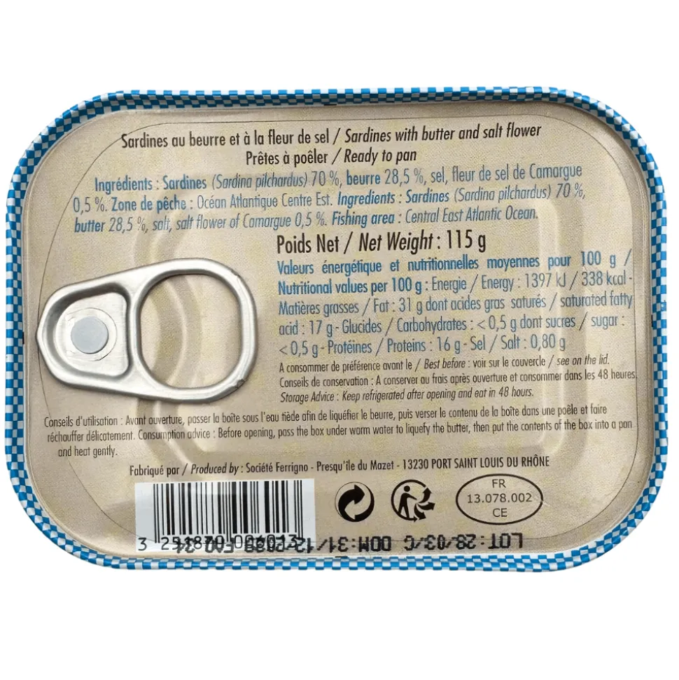 Ingredients: SARDINES (Sardina pilchardus) 70 %, BUTTER 28,5 %, salt, salt flower of Camargue 0,5 %.