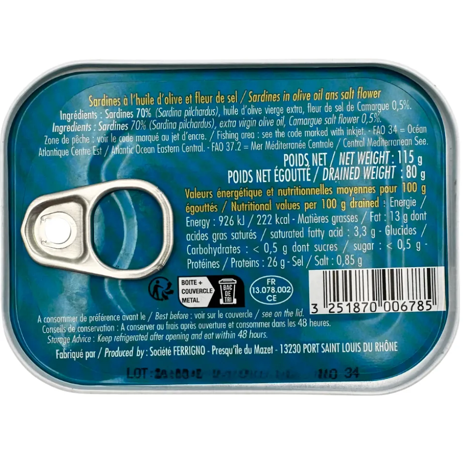 Ingredients – SARDINES (Sardina pilchardus Walbaum) 70%, extra virgin olive oil, pastis 5%, salt